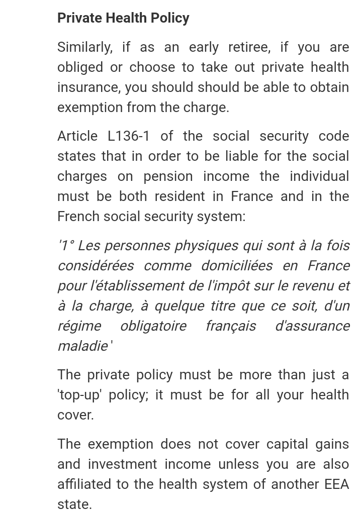 My understanding from the attached note is that by virtue of not being in Secu, and being fully insured privately for medical issues, I am not liable for any prélèvements sociaux. I’ve now been here for more than 3 years, and each year have religiously ticked the appropriate boxes in our tax returns confirming we are not in Secu. No demands - so far(!) - for any prélèvements sociaux on my pension. I do though pay it on interest received.
