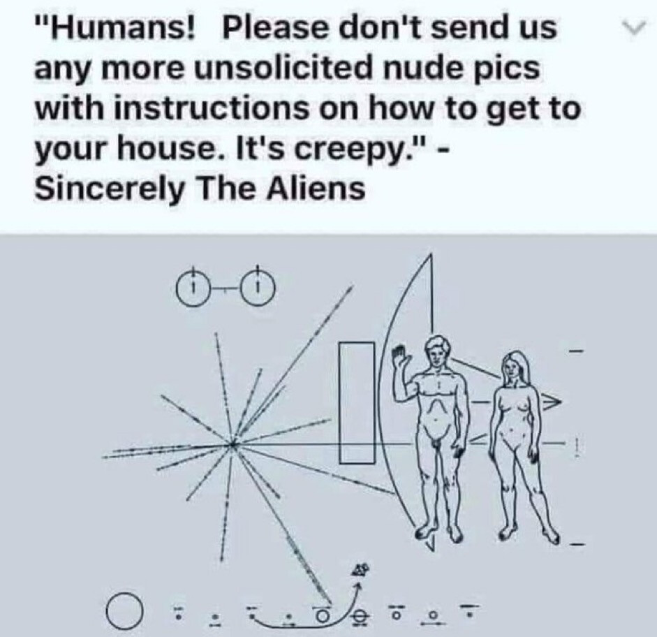 This is possibly the silliest official astronomical project ever - why should aliens be able to âreadâ a line drawing? And even if they could would they necessarily correctly interpret the raised arm, open palm âpeaceâ gesture.