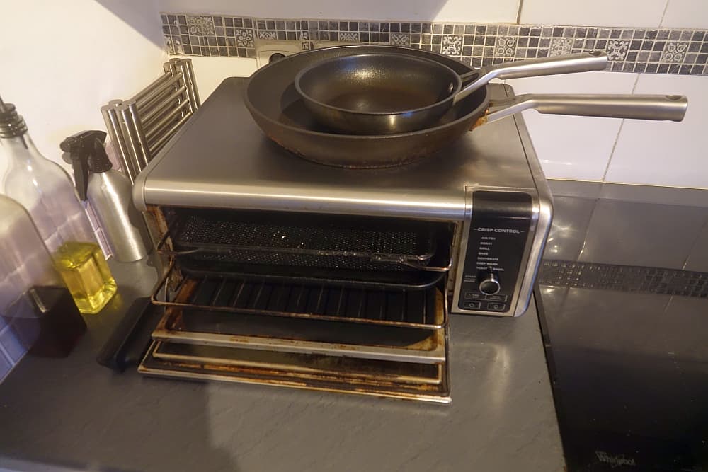 This is our air fryer. It works well along side and compliments our normal cooker. It has a flat top which is great when you want to remove a hot tray to turn stuff over when cooking.