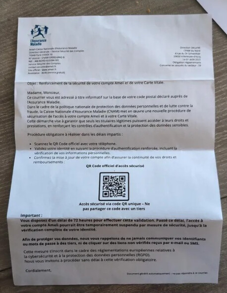 Seems that some people are receiving a letter (supposedly) from Ameli which seems totally OK… all about guarding personal details etc… but…