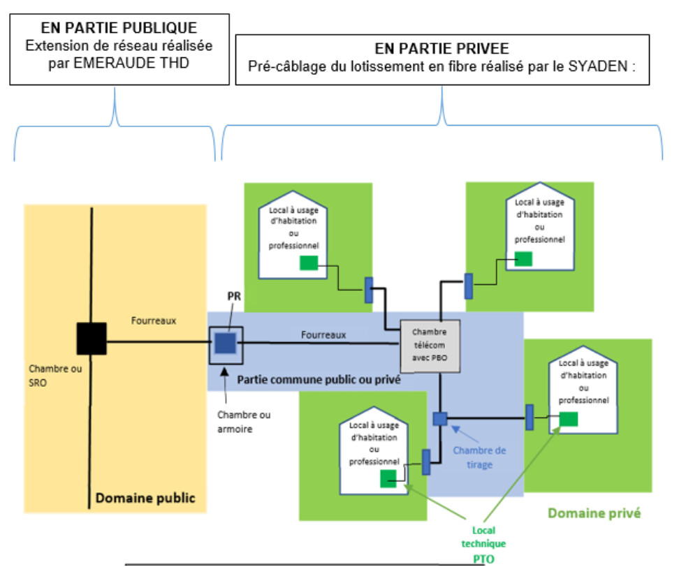 The bit in yellow is the fibre backbone which you never see. This joins the local fibre installation in blue (the cabling to the poles) and the house connection in green. In your case Bouygues are responsible for the green bit and the RIP are responsible for the blue bit. In many cases, the yellow bit is provided by Orange but in our case it’s a local public company called Emmeraude THD.