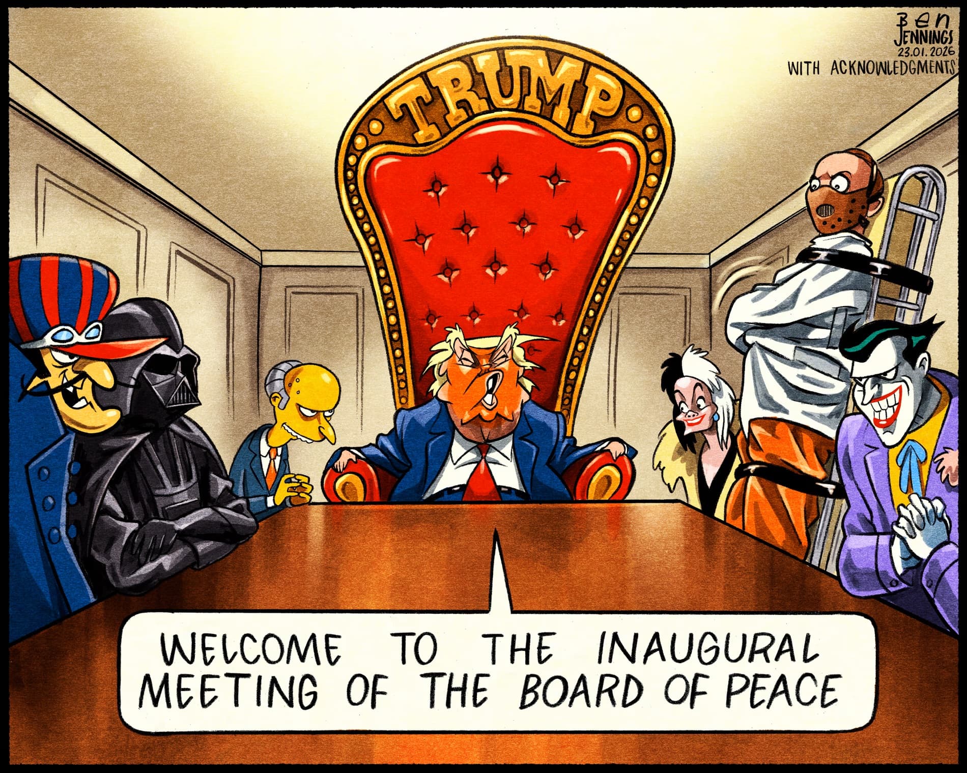 Ben Jennings is clearly stacking archetypal villains — cartoon, cinematic, and political — to sharpen the satire of the so-called “Board of Peace.”