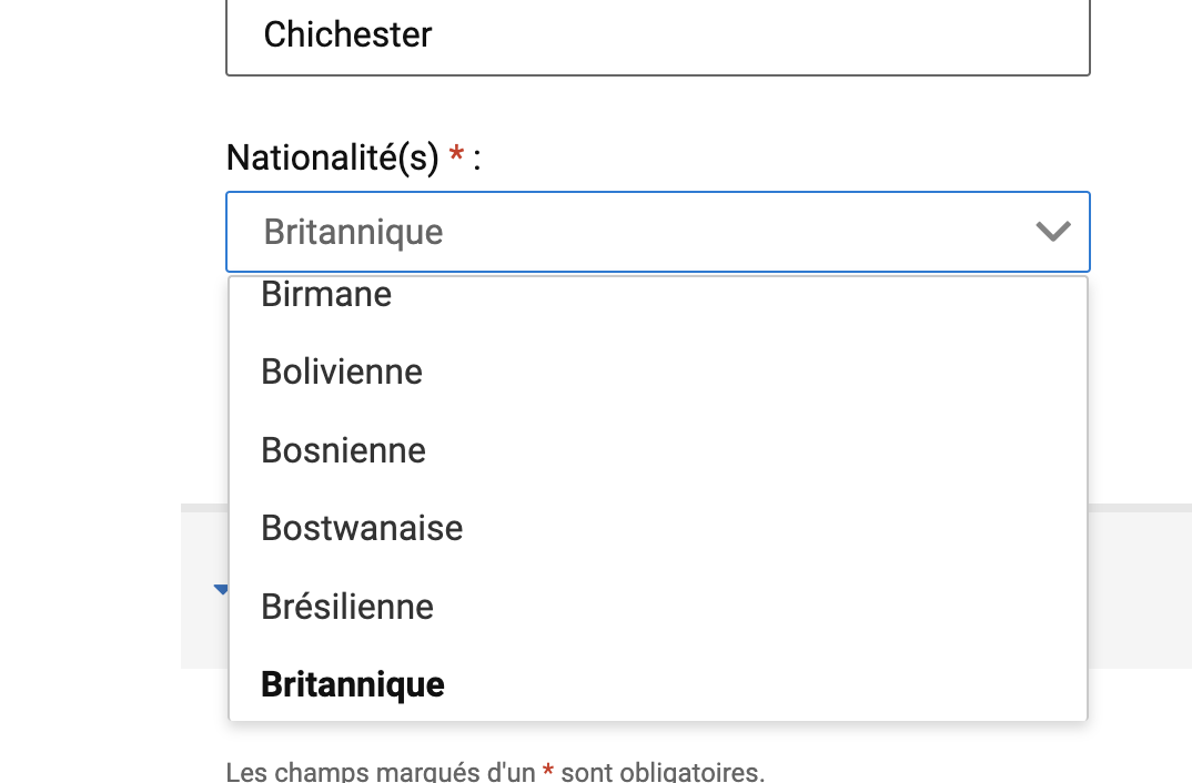 Using the regular online EU carte de sĂ©jour application form on ANEF/France Titres, why not select the nationality of your EU husband from the drop down list. After that, very clearly explain in the âfree formâ field at the end of the online form exactly why youâve been âforcedâ to do that, and then specifically draw their attention to your UK passport, which youâve presumably uploaded as part of the normal EU CdS application process. Thereâs presumably some IT programming glitch involved, producing the list of EU countries only. Itâs a bit disappointing they havenât resolved this problem to date.