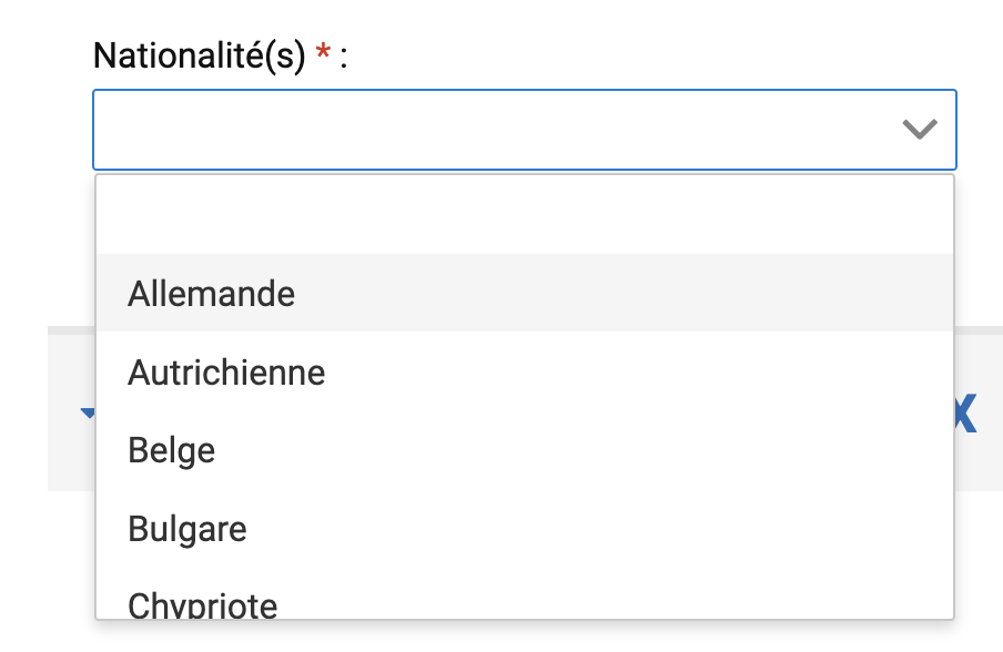 I read from French Services web-site that I have to apply for a titre de sĂ©jour. They point me to the Ătrangers en France form but i canât proceed as in the drop-down list of nationalities there are only EU states.