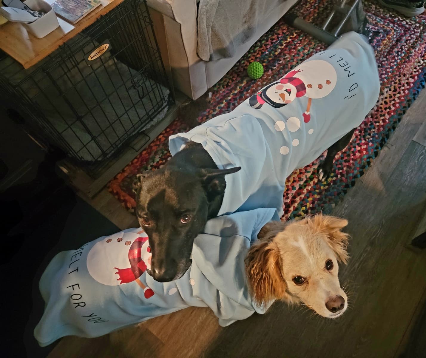Pippi (black) and Obi say hello! It’s cold here, gong into another round of sub-freezing nights and just-above-freezing days, so the holiday hoodies will remain in use!