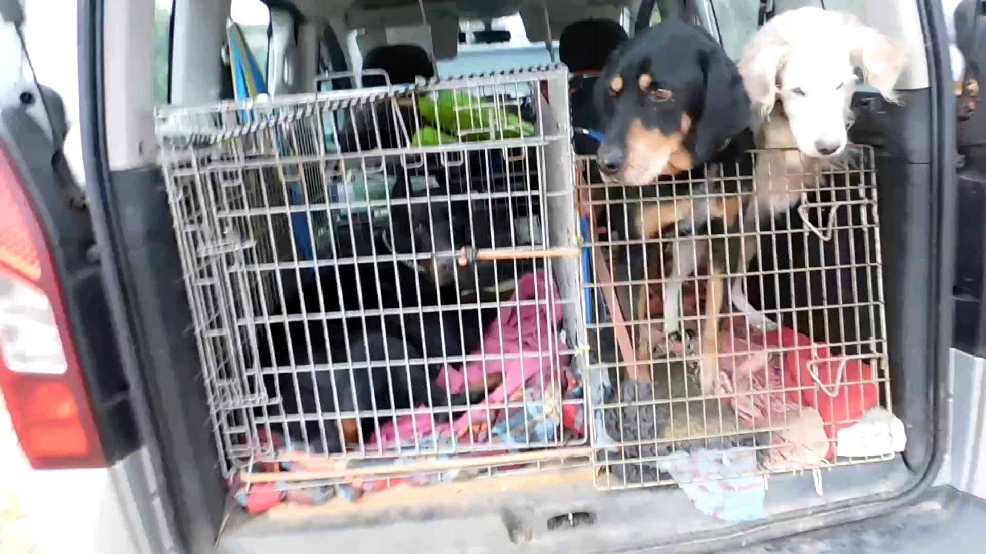 This is him in the cage to the left along with my 2, Jules and Galys. He was gentle and calm with them and no trouble at all on the journey, but he is subdued, underweight and bears at least one scar.