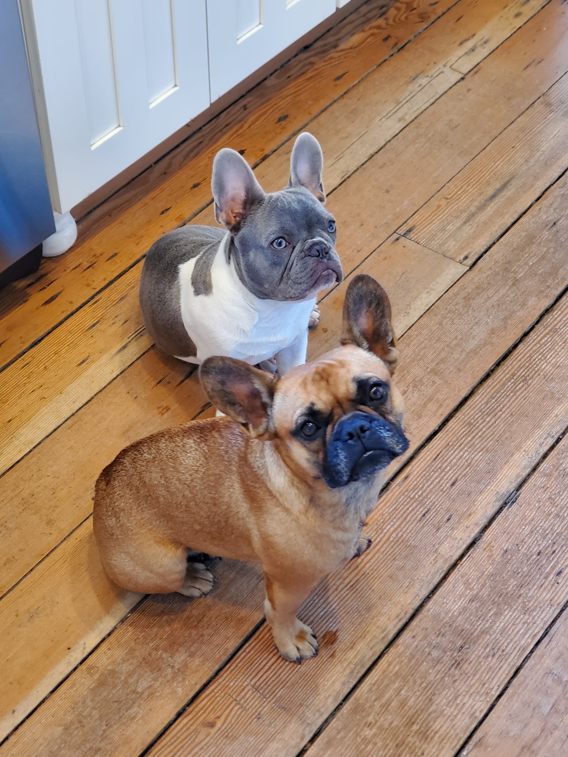 Olivier (Ollie), the grey one, and Isabel (Izzy), the potato. Half siblings brought with us on the plane. (We never dress them up, but their daycare in the US did holiday photos.) Ollie is super chill, Izzy is a line-stepper = we’re pretty sure that in the last photo, Izzy is contemplating pushing her brother off the steps. They are well spoiled.