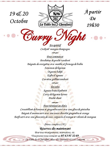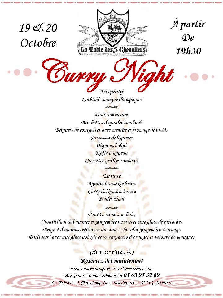 The new and exciting restaurant La Table des Trois Chevaliers, in the fantastic medieval setting of Lauzerte, has the honor to invite you to reserve a table for our first Curry Night, taking place on Friday the 19th of October and Saturday the 20th of October.