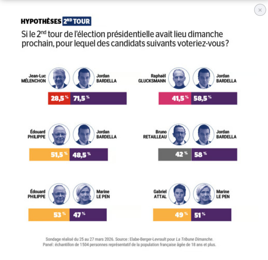 A significant national poll today gives, for the first time, Édouard Philippe beating Jordan Bardella in a hypothetical second round of voting in next year’s Presidential election.. EP is the only potential candidate recorded as beating JB.