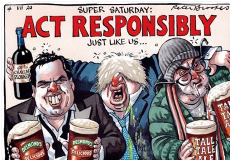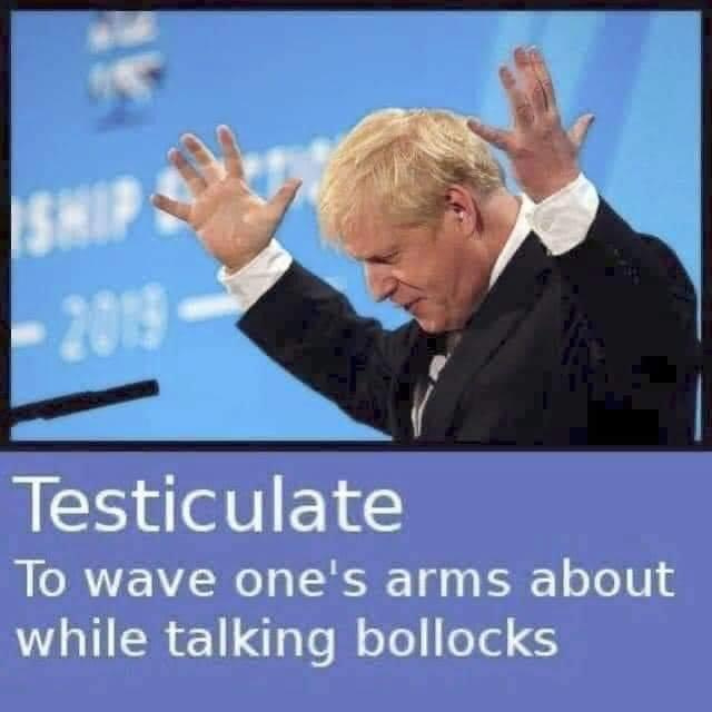 Doris had a face like a smacked arse as he waddled out to deliver in faux-grave mock-Churchillian style his Super-Saturday valedictory unction on the end of confinement. Slouching at his ridiculous “Number 10” light-oak ‘Statesman’ - style podium, flanked by draped Gilbert-and-Sullivan “Lord High Executioner” Union Flags, he jerked à contemptuous thumb at his his medical minion.