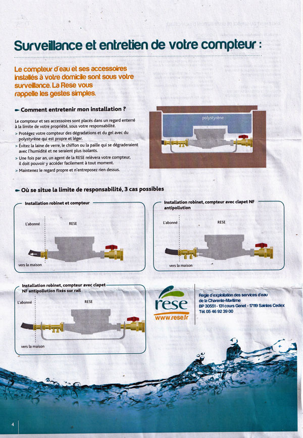 I think this inspection, as far as I’m concerned, is to find out if I need an antipollution valve installed for my water supply. I think I don’t, don’t have a swimming pool etc. Of the 3 possibilities shown here I fit the 1st category, ‘Installation robinet et compteur’. The other 2 categories need antipollution valves, but I’m not a plumber so might be mistaken. Shall wait to see what the RESE agent say when he inspects.