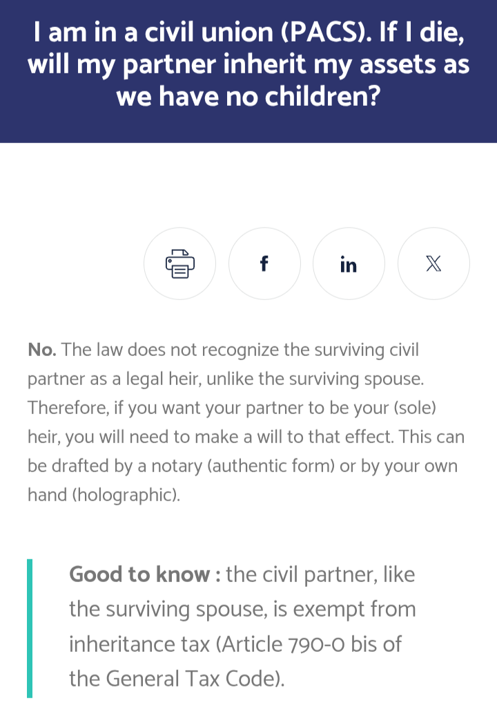 I obviously defer to your greater knowledge, but our Notaire explicitly told us that provided two PAC’d individuals had wills leaving their all assets to each other, they absolutely had a right to each others assets on death, and also benefited from the inheritance tax exemption similar to spouses. She said that without wills, there is no automatic right to the others assets. If she’s right, putting aside the issue of children, (and I appreciate that might change the situation).then marriage is not necessary - it’s doing proper wills that counts?