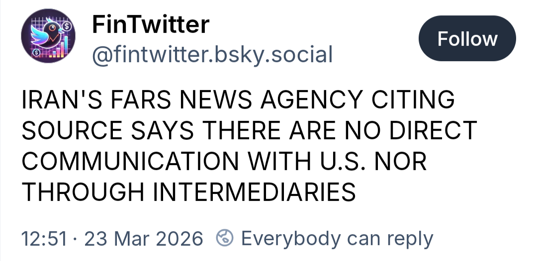 BBC reporting Trumps postponing strikes and oil price has gone down a bit as a result. But they are also reporting that an Iranian source says they haven’t had any conversations with Trump.