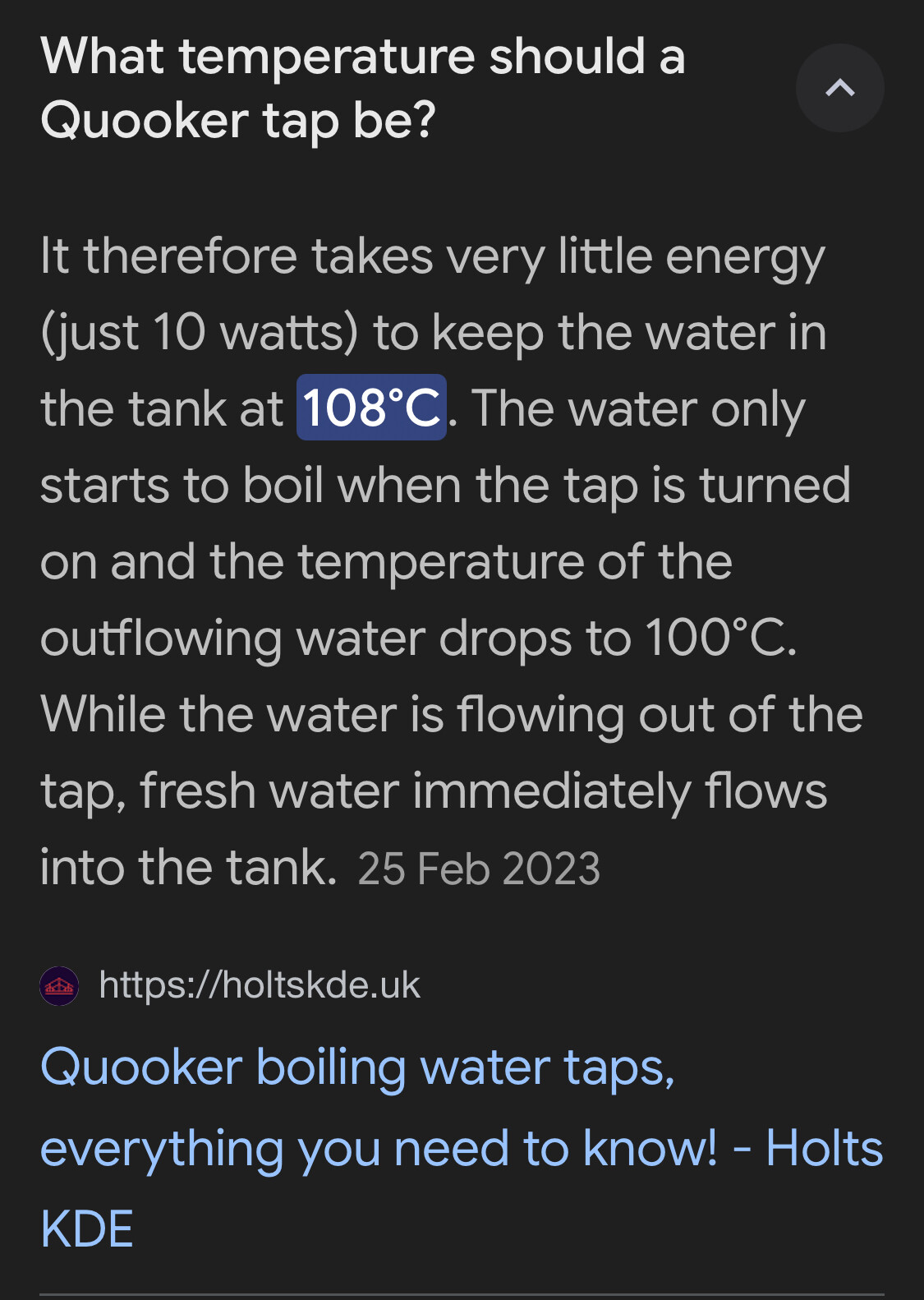 Also I believe the Quooker taps aerate the “boiling” water stream to turn it into fine droplets so it will not cause a serious burn if you did put your hand under the flow momentarily. They contrast this with a kettle of boiling water tipping over which apparently would cause an immediate scald.