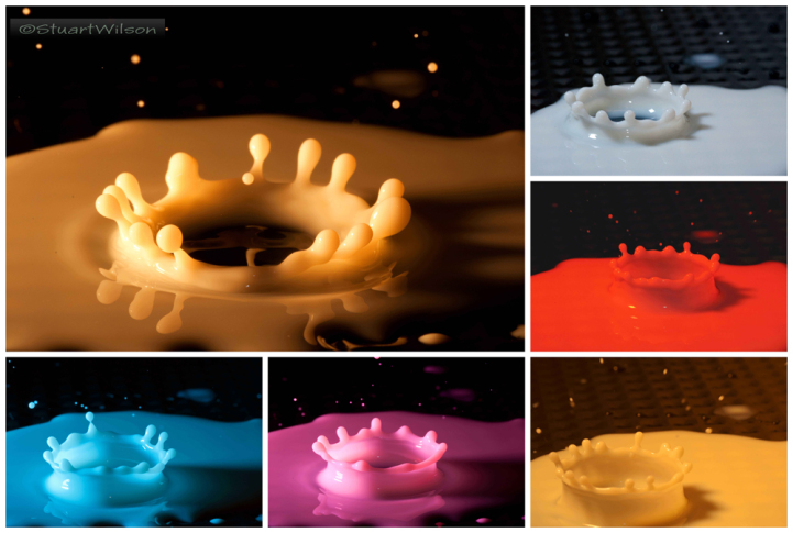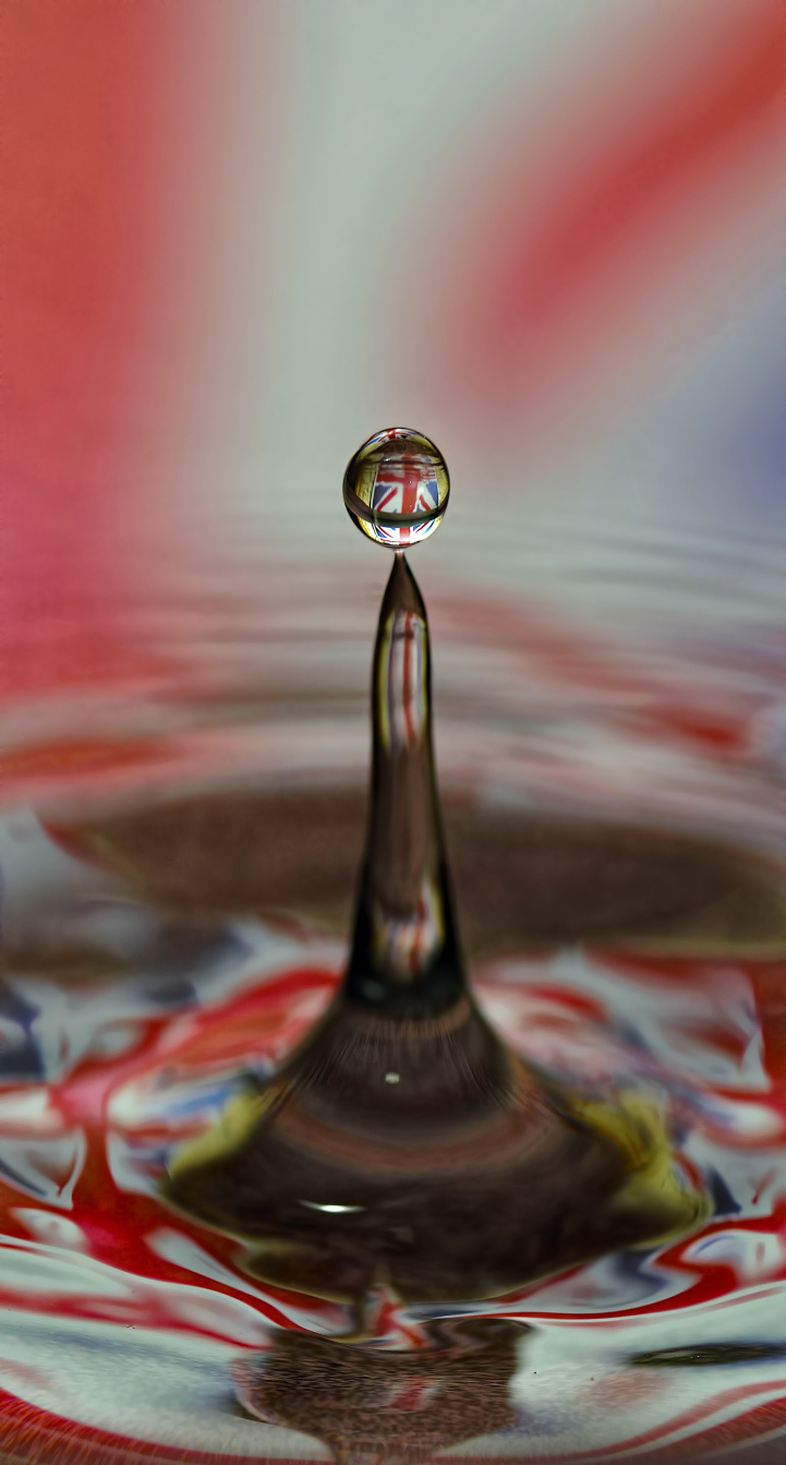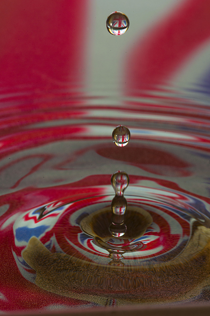 The drop was created by fixing a plastic bag about 30-40cm above a tray of water. This water was a couple of inches deep so you get single drops bouncing back up. If you have little or no water in the tray you can create crown effects. The background is an A4 sheet of paper with a wavy union jack printed onto it. Probably about 20-30cm behind where the drop occurs. I used off camera flash fired onto the paper using the command mode for the built in flash on the camera. The settings were ISO100 1/125 at f11. I was using the 105mm Nikon Micro lens so need to increase the f stop to get any depth of field. Here are a couple more examples.