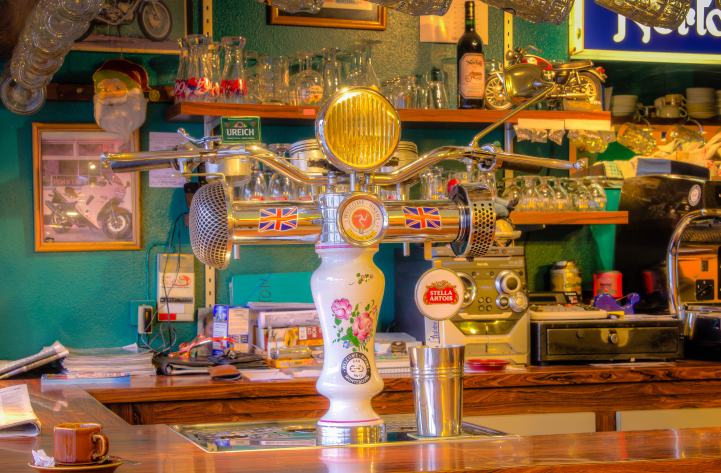 Owner found a way to drink and drive; build beer tap from bike font-end parts. Very cool.