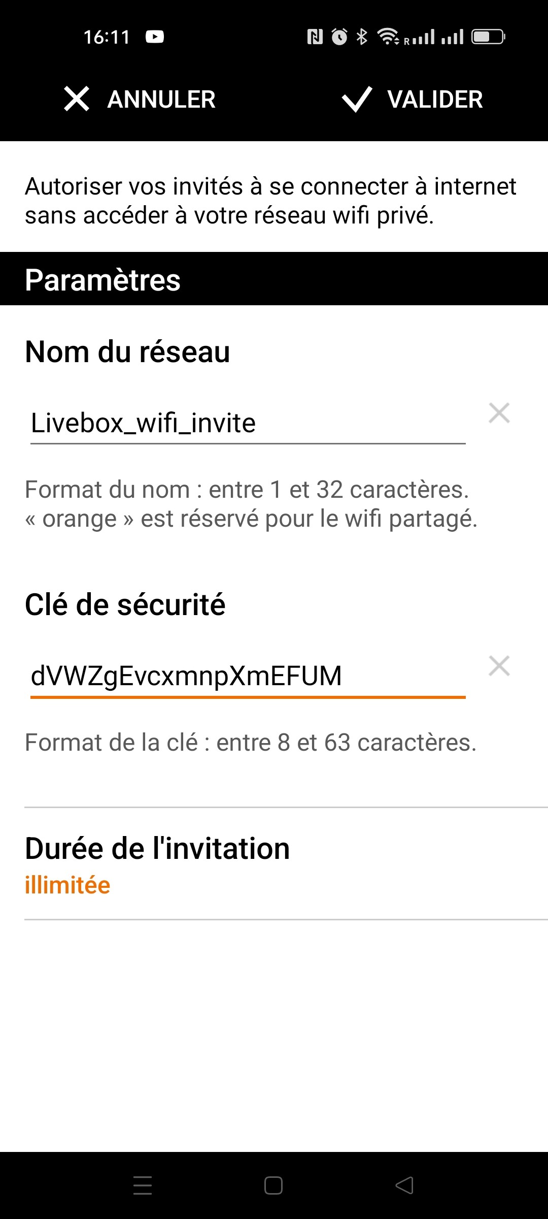 In the app, you just click “wi-fi invitée”. It asks you to choose a name for this guest wi-fi network plus create a password. The minimum password length is 8 characters so there should be no issues with entering it on your Hyundai TV. You then choose how long it should be created for but can choose “illimité”.