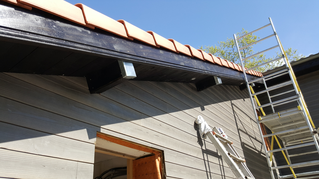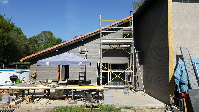 The front wall was re-rendered by hand in the old way (literally throwing trowels of lime render at the stone) as the end walls will be in due course. The rear wall, however, which with its patio doors and glazed wall above them makes no pretence at echoing the original, was insulated and clad with Eternit Cedral cladding.