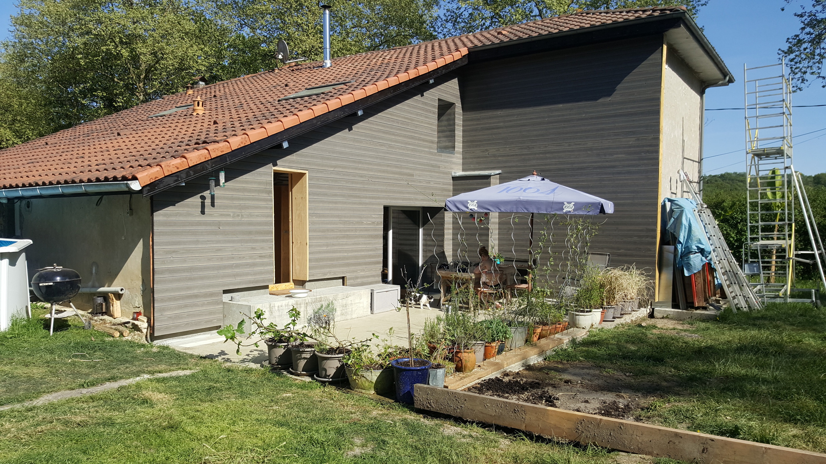 As a result, many people in our village think we have done very little to the house as the original doors are still there, the windows look much as they did before and only a new main door in the side wall suggests we have remodelled the interior. We even kept an old door and shuttered window which had led into the épicerie but is now blocked up with a wet room on the other side. The look of our house from the street has universal approval. Only when people come in do they realise how it has changed. Viewed from the rear, a modern wall is seen until you look carefully and see the coin stones at either end of the cladding which we left exposed to emphasise the original structure.