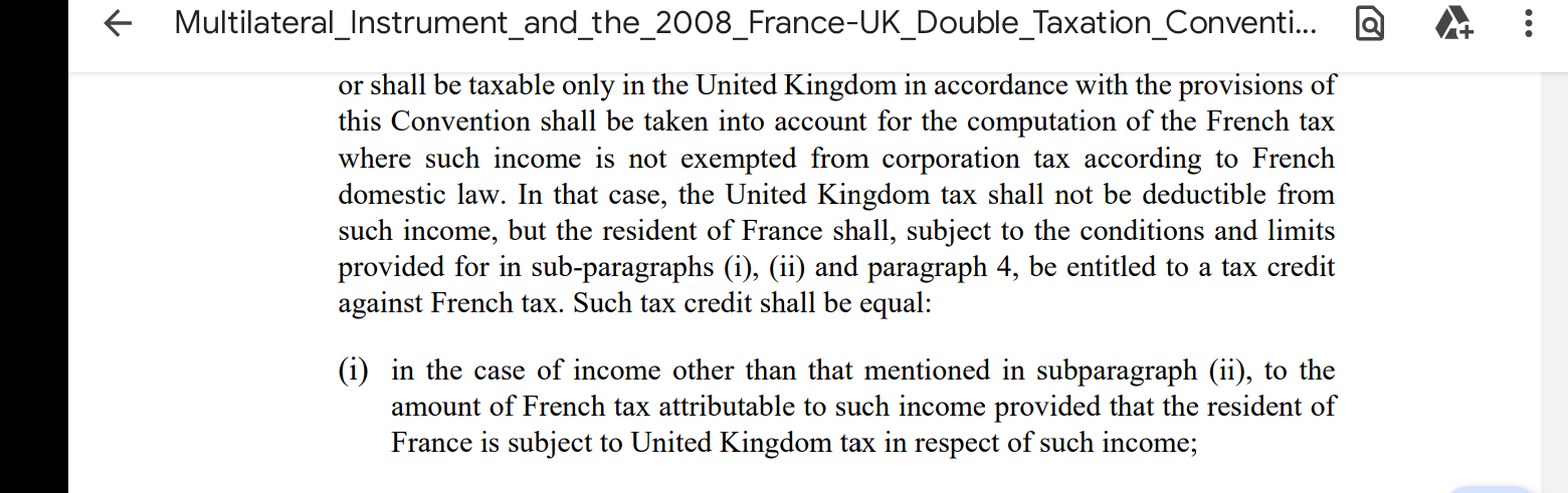 âLâexpression en cause ne saurait permettre Ă la France, sâagissant des rĂ©sidents de France personnes physiques, de ne pas appliquer le crĂ©dit dâimpĂŽt prĂ©vu Ă lâalinĂ©a (i) du a) du paragraphe 3 de lâarticle 24 aux contributions sociales françaises, au motif quâaucun impĂŽt sur le revenu ou sur un Ă©lĂ©ment du revenu de nature Ă©quivalente nâexiste au Royaume-Uni.â