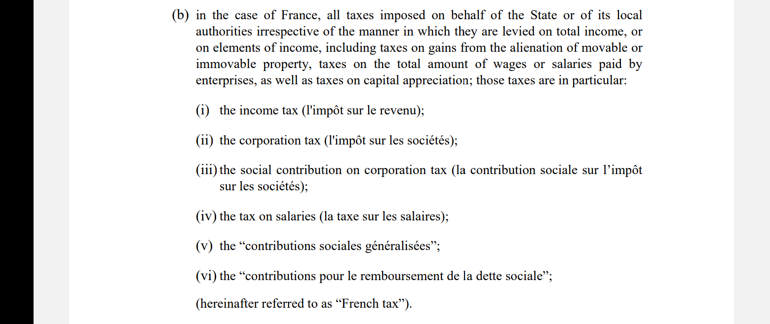 This is where it gets interesting technically. If you look at my post above (#8) youâll see (in its official Tax Bulletin notice) that France treats CSG and CRDS as âtaxesâ in its treaties. France goes further in the UK/France treaty and specifically calls CSG and CRDS âFrench taxâ. See screenshot below.