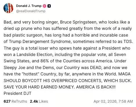 ‘President Trump has avoided talking about the war in Iran by attacking rock star — and critic of the US president — Bruce Springsteen for having bad plastic surgery and called on people to boycott his concerts.’