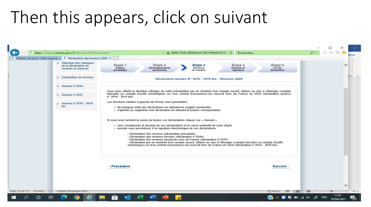 At the end there shouldn’t be anything other to declare after you have declared all the accounts you have numbered in the first screen. You just press « suivant » to move on.