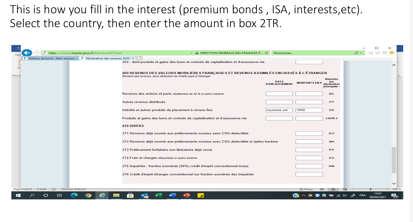I wrote to the Impots through the messaging service on the 11th and had a reply last night. I asked them what I needed to do do to move on with Interest received page as it wouldn’t allow me to as it was asking for country of origin of the interest. I said I had filled in part 260 2TR with Royaume-Uni and they replied that was all I needed. However, gone back into it today and find that the interest has been put automatically into box 2TR under section 250. Every time I change it to 260, it goes back to 250. I wonder if I have ticked something earlier (can’t see anything) that is causing this to happen. This is on the 2047 annexe.