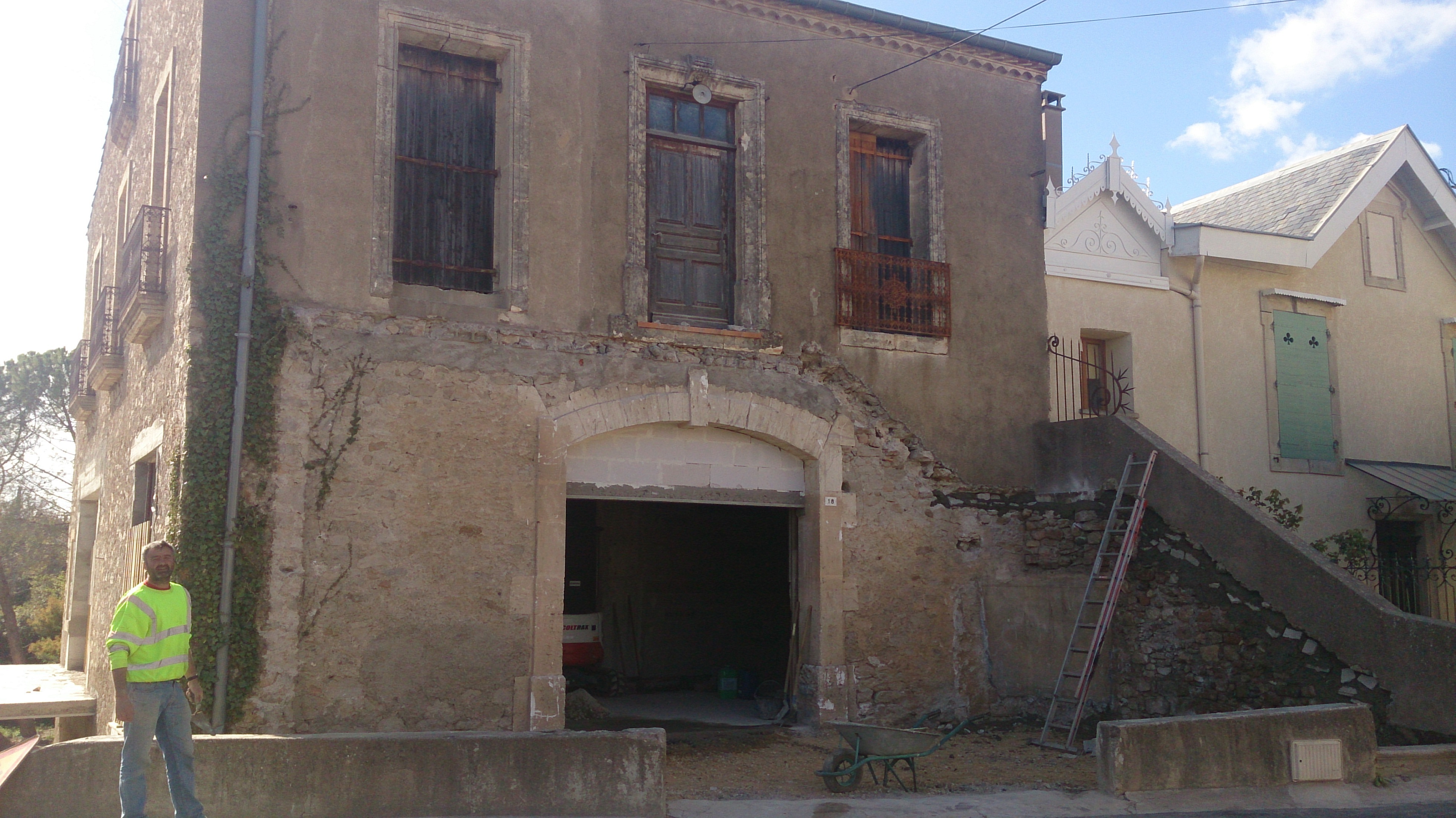 The front of the house is the only side which has been rendered over the years as modifications have been made including at one point an external loo on the balcony to the left hand side where the original stonework was removed and it was tiled with internal floor tiles. The demolition exposed the stone work and reinforced our intention to clean off the render and bring it back to stone. This is something that is in conflict with the recommendations of the habitat department in our area who want us to re-render the facade fully and do not want it to be pierre apparante like the rest of the house. As we are insulating the inside of the house we do not wish to render the outside. They also don't want us to keep the existing metal balcony which I wish to reposition to the centre and install two simple ones left and right. Instead I either have to find a money tree and have 2 exactly the same hand-made or have all 3 the same and newly made as cheap as you like. BUT I want to keep the old one...finally they want our ciporex infill (which we intend to plaster with lime plaster similar colour to the stonework surround) to be replaced with glass (this would be very expensive to have made to a similar quality as the windows - triple glazed) or an alumininum facade (which reminds me of a shop front so no thanks). As I result we have to forgo the opportunity of a subvention (grant) to make nice the facade - but hey ho I'd rather do it as we want to even if it means we have to live with it half finished for a while longer.