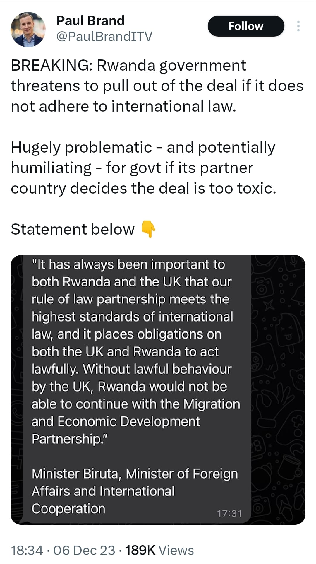 Reading this article suggests the Supreme Court finding was perhaps more about the trustworthiness of Rwanda in sticking to the terms, i.e. there’s a risk of refoulement happening. In which case I stand corrected.