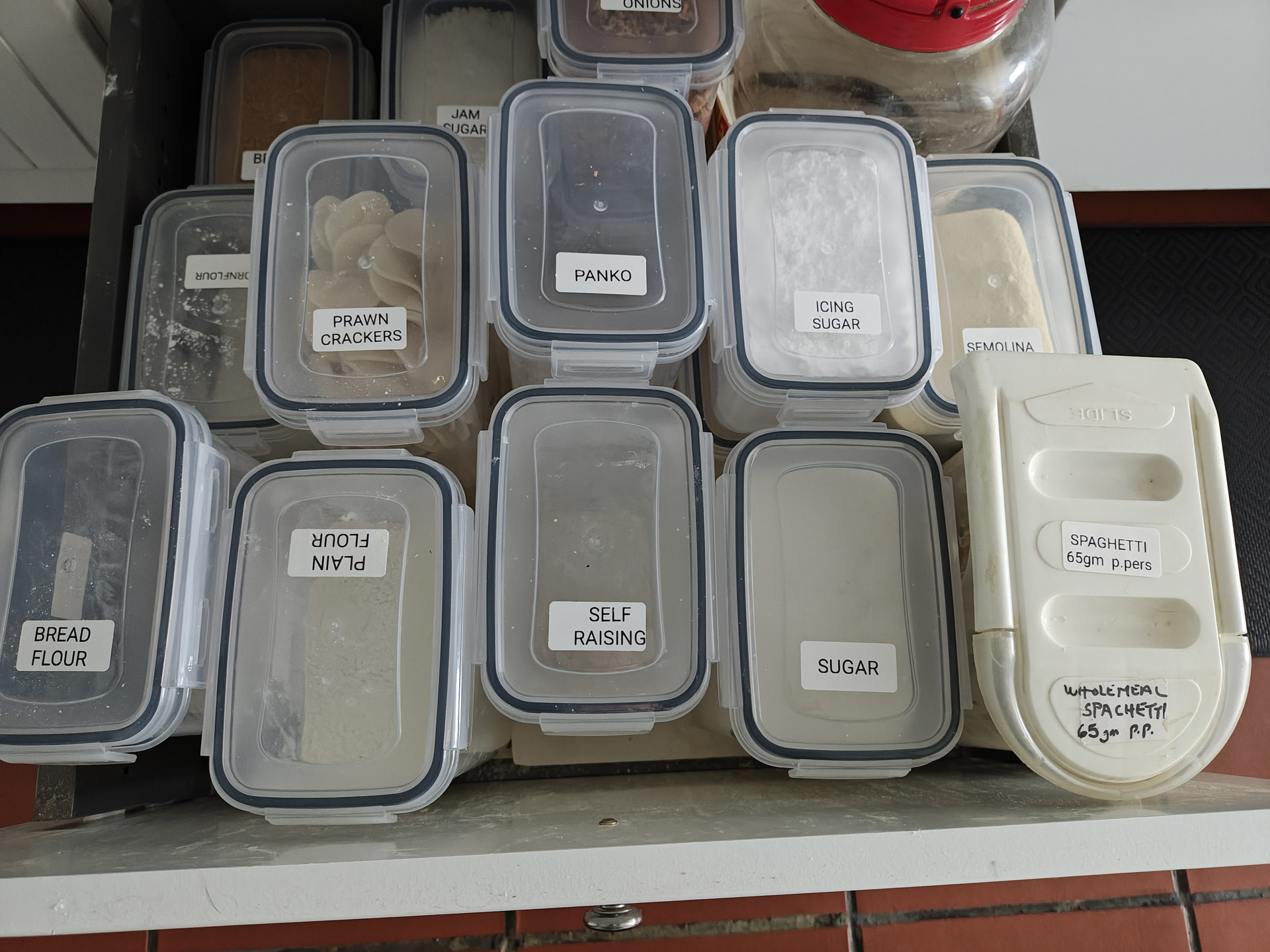 I buy the L’Or instant coffee grains for first cup in the morning and they have airtight stopper lids which I have used in my pantry and kitchen drawers to put dry things in like flour, dried fruit, teabags, sugar and so on. Since my son was plagued by weevils in his store cupboard from keeping flour and other dry stuff in their original paper/card packaging, everything is transferred to storage jars from said packaging.