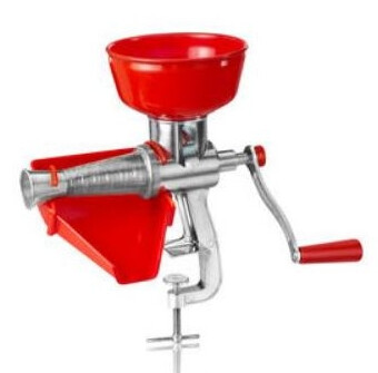 When I make tomato soups and sauces I use a Passapomodoro. They are available in many French supermarkets. The tomatoes go in the hopper, are forced along an Archimedes screw in the tube, and the pith and pips exit the end into a bowl while the clear juice comes through the cone shaped sieve and pours down the chute in a separate bowl.