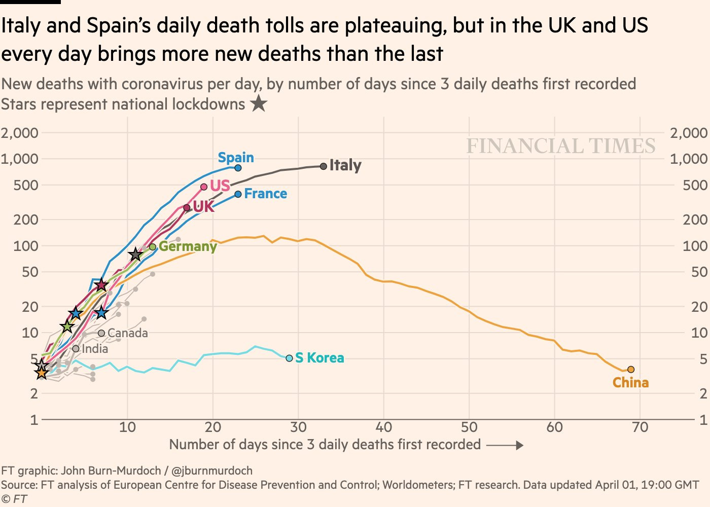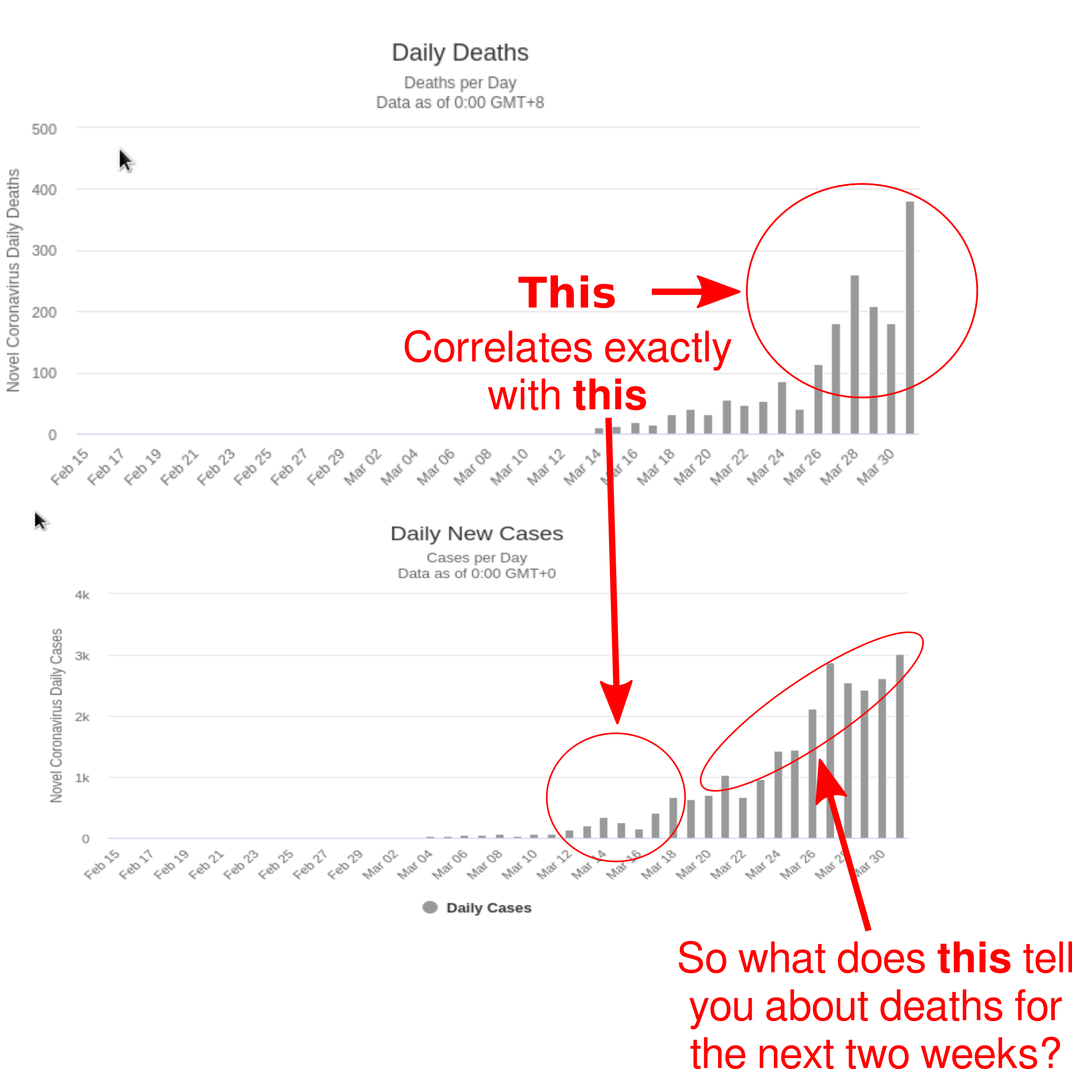 There is a nice correlation in the shape of the graph for deaths in the past few days and the new cases about 14 days ago. This is “about right” based on the Chinese data (18 days symptom onset to death) but the apparent mortality is huge - 50% or more. That fits with the local hospital which has had about 50:50 discharges:deaths.