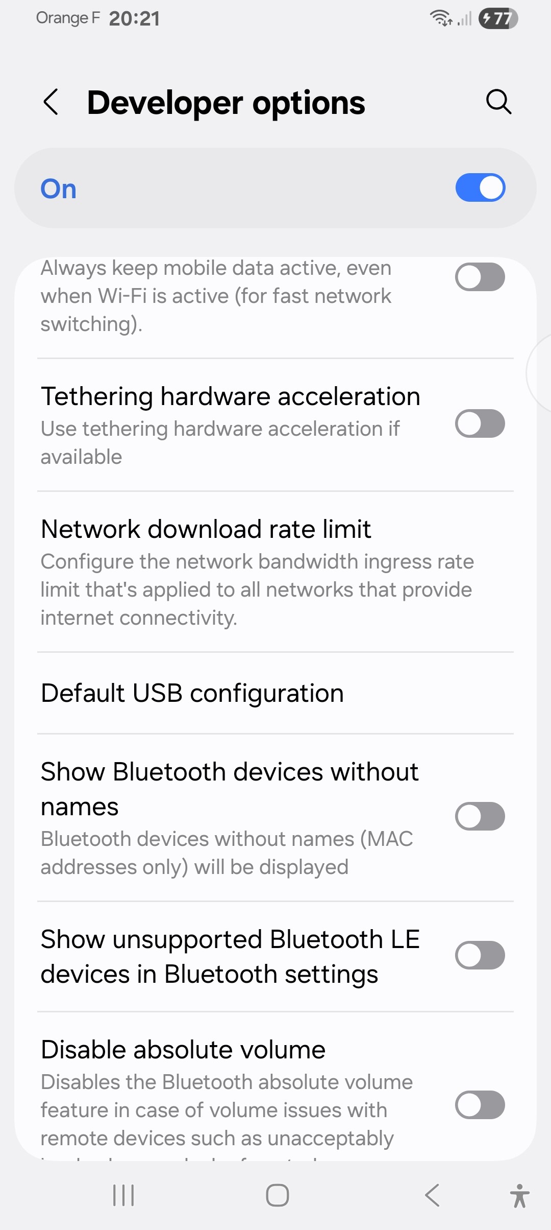 Note: at the top of the “Developer options” page you can hide this menu from the phones Settings again by setting the option to “Off”.