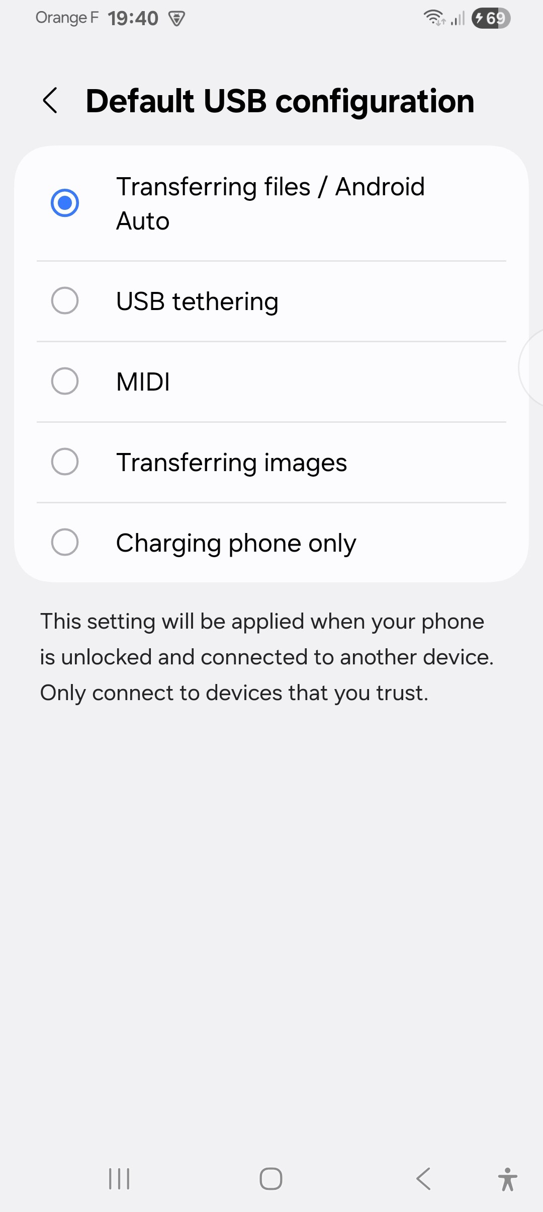 To change from “Charging phone only” mode to “Transferring files/ Android Auto” we need to enter the Developer menu :