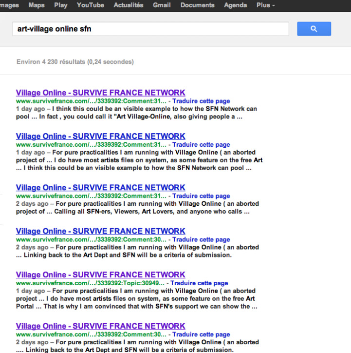 James has very kindly approved the project and is happy with the attention given to the SFN Brand Umbrella... but would prefer the 'cleaner' text based Icon that we all know. I have done a test on the keyword out-come and have deduce that 'SFN Arts Village Online' has more 'cache' effect i.e. is a the top of the rankings, whereas just Arts Village is too overused. See below:
