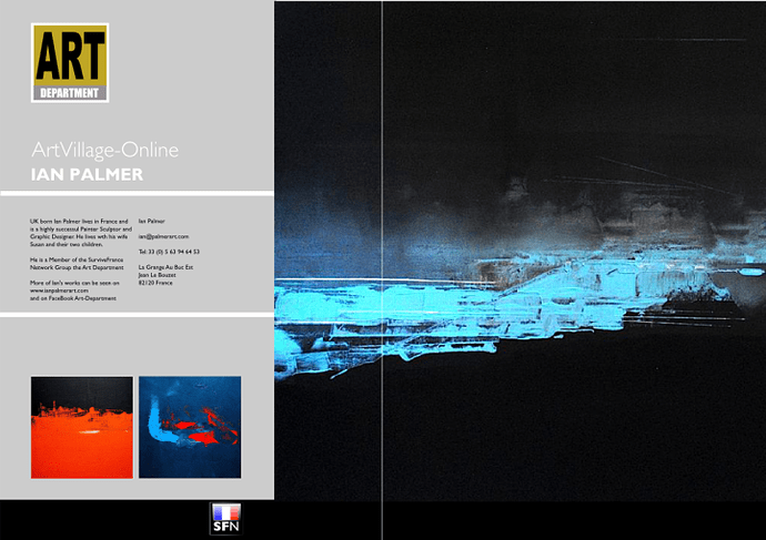 Whilst you have been do-dos the Studio has been 'issie wizzy let's get busy' tweaking and fine tuning the Arts Mag cover. We have made a few mods which will be apparent, ie I have simplified the 'Art Department' logo, so I will need clearance from Neil on that, and have also taken Jon Lisle-Summers' painting to see if this format will sit comfortably with a 'bleeding off the page' resolve when it come Landscape pieces.